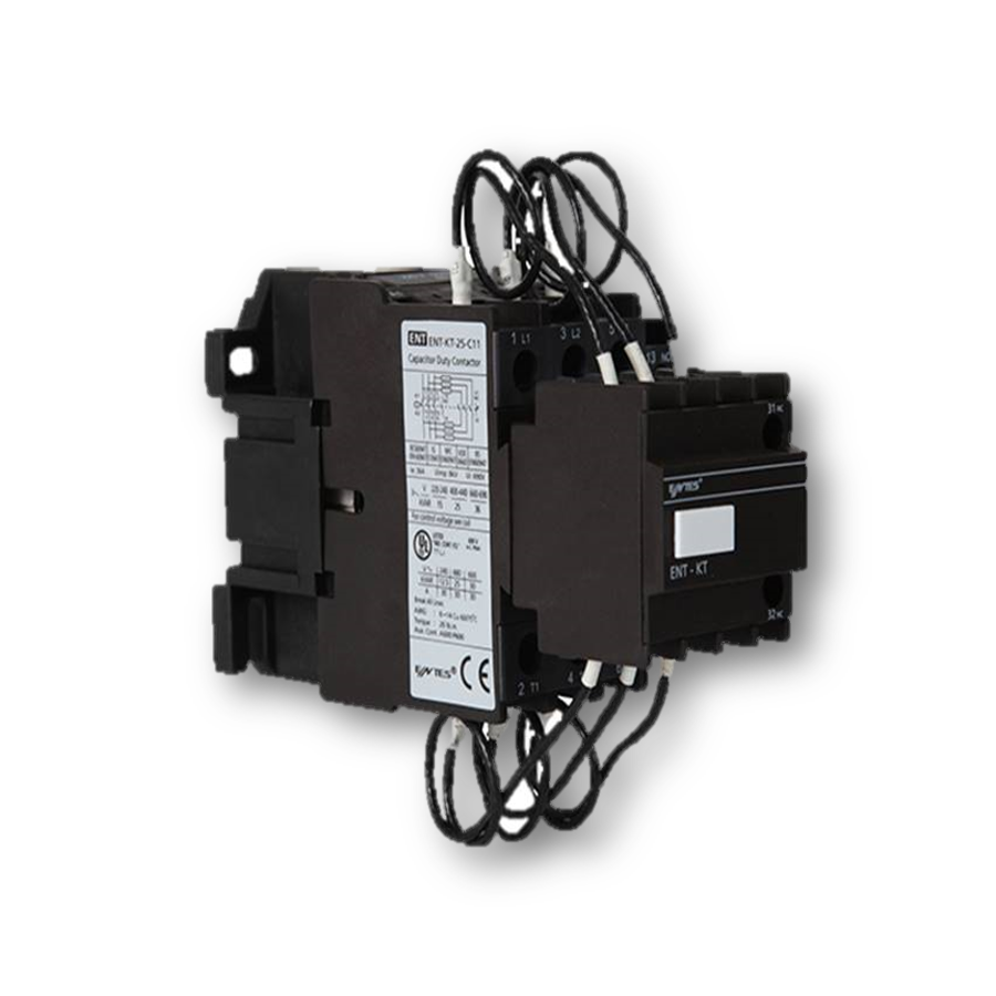 ENT.KT Series Capacitor Switching Contactor are two-stage contactors engineered specifically to address and mitigate high inrush currents, a common challenge in power factor correction systems. These specialized contactors are equipped with an auxiliary contact block that intelligently transmits the inrush current through damping resistors during the initial energization phase. By doing so, they effectively reduce the surge of electrical current that typically occurs when capacitors are switched on, keeping the excess current within acceptable and safe limits. This ensures a smoother and safer power transition, ultimately contributing to the long-term performance and stability of the system. Particularly in the 2.5 and 5 kVAr models, ENT-KT contactors are constructed with a special reinforced contact alloy that delivers enhanced durability and resistance against repeated high inrush currents. This advanced material selection ensures that the contact points do not degrade quickly under stress, thereby extending the operational life of the contactor and enhancing the overall reliability of the power factor correction system. ENT-KT contactors offer a robust and dependable solution for efficient capacitor switching in industrial and commercial power systems.
